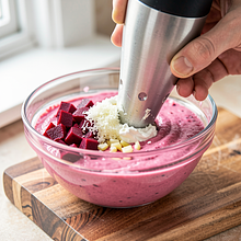 Creamy and flavorful beet and horseradish dip is a Polish spring snack that combines the sweet, earthy taste of cooked beetroot with the sharp, spicy accent of horseradish. With the addition of cottage cheese and sour cream, the consistency is smooth and slightly tangy, while lemon and garlic enhance the aroma. The dip works great as a spread for rye bread, an accompaniment to baked potatoes, a platter of raw vegetable snacks (radishes, carrots, cucumber), or as part of a party board. Aesthetically presented, it has an intense pink-red color accented with a green sprinkle of dill — striking and appetizing.