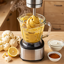 Transfer the sautéed cauliflower to a blender or a tall container for an immersion blender. Add natural yogurt, lemon juice (squeezed from about 50 g of lemon), the remaining portion of curry, pepper, and the remaining salt. Blend in pulses for 30–60 seconds, then blend until smooth for 60–90 seconds, until the dip reaches the desired consistency — smooth and creamy or slightly grainy, if you prefer that texture. If the mixture is too thick, add 1 tablespoon of water or more yogurt.