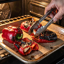 Place the tray in the preheated oven and bake the peppers for 20–25 minutes. Every 5–7 minutes, turn the peppers with tongs so that each side chars and black spots appear — this is a sign that the skin is separating from the flesh.