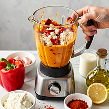 In a tall blender container, place the chopped roasted peppers, semi-fat cottage cheese, 18% cream, pressed garlic (through a garlic press), and lemon juice. Add olive oil and smoked paprika. Blend in pulses for 30 seconds, then at the highest speed for 30–60 seconds until the mixture is smooth and silky.