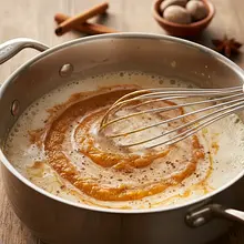 Remove the hot pumpkin milk from the heat. Now it's time to froth. You can use an electric milk frother by placing it in the saucepan and frothing for about 30 seconds until a thick foam forms. Alternatively, pour the hot milk into a French press (filling it no more than halfway) and vigorously move the plunger up and down for about a minute until the volume of the milk doubles and foam forms.