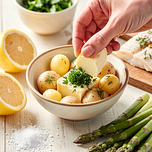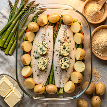 Delicate cod fillets baked with herb butter, served on a bed of young potatoes and spring asparagus. The dish combines the classic Polish taste of fish with seasonal accents — young potatoes and asparagus add freshness, while parsley and optional dill enhance the aroma. A light hint of lemon brightens the flavor, and the optional breadcrumb topping adds a pleasant texture. Perfect as a simple yet impressive spring lunch; it pairs wonderfully with arugula salad or a cool garlic butter sauce. The dish has a nice balance between the creamy texture of the fish, the softness of the potatoes, and the slightly crunchy asparagus, and it looks aesthetically pleasing — the fillets shine with herb butter, sprinkled with greenery.