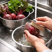 Wash the beets under running water with a vegetable brush, trim the ends (save the leaves for another use). Wrap each beet tightly in aluminum foil to retain moisture. Place them on a baking sheet lined with parchment paper. Bake in an oven preheated to 200°C (top-bottom) for about 50–70 minutes, depending on the size of the beets. Check with a fork after 50 minutes: it should easily pierce the beet, and the flesh should be soft. After baking, let the beets rest for 10–15 minutes until they are cool enough to handle.