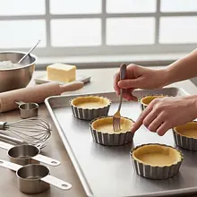 Dno każdej tartaletki nakłuj widelcem w kilku miejscach, aby zapobiec wybrzuszaniu się ciasta podczas pieczenia. Na wierzch każdej foremki połóż kawałek papieru do pieczenia i wysyp na niego obciążenie - może to być specjalna ceramiczna fasolka do pieczenia, suchy groch lub ryż. To tzw. 'pieczenie na ślepo', które zapewnia płaskie dno.
