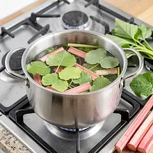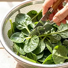 Prepare the sorrel: trim the tough stems (about 3-5 mm from the base of each leaf), place the leaves in a large bowl and rinse several times under cold running water, turning with your hand to remove any sand. After rinsing, dry the leaves in a salad spinner or spread them on clean paper towels and gently pat dry.