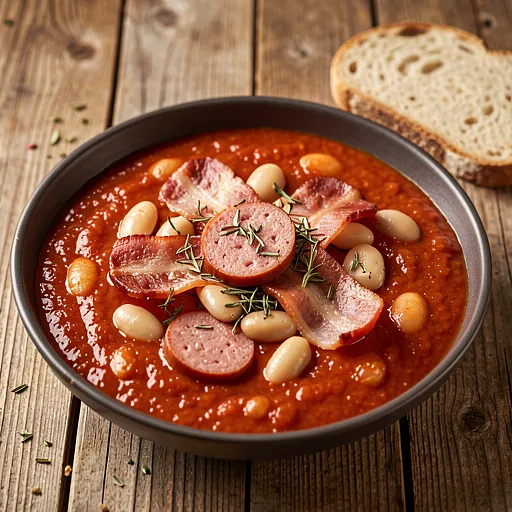 Brittany-style bean stew is a Polish rustic one-pot dish with a spicy, slightly tomato flavor — a combination of white beans with smoked bacon and sausage. In the gluten-free version, we use gluten-free products and serve it with gluten-free bread or potatoes. The dish has a hearty texture, a contrast between the soft beans and the crispy fried sausage, and the aroma of marjoram and bay leaves. Great for cooler days, perfect as a filling lunch or for a home gathering, easy to prepare in one pot, it can be made quicker using canned beans. Visually: a thick, brick-red sauce with pieces of meat and carrots, sprinkled with fresh marjoram.