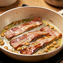 Heat a wide pot with a thick bottom (at least 24 cm in diameter) over medium heat. Pour in the rapeseed oil. When the oil is slightly heated (after about 30 seconds the oil starts to move slightly), add the chopped bacon. Fry for 4-6 minutes, stirring occasionally, until the bacon releases its fat and is slightly crispy at the edges.