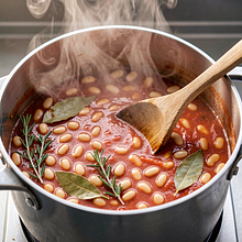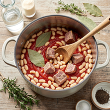 Add the drained beans and tomato passata to the pot. Pour in water (about 500 ml). Add the bay leaf, marjoram, sugar, and salt and pepper. Gently stir with a wooden spoon to combine the ingredients without breaking the beans.