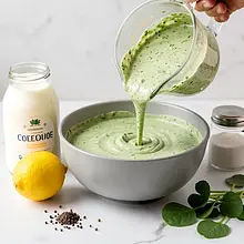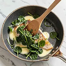 To the sautéed sorrel, add 18% cream (150 g), the juice of half a lemon (50 g), and mustard (15 g). Reduce the heat to low and gently heat for 2–3 minutes, stirring until the ingredients combine and the sauce thickens slightly — it should coat the back of a spoon. Taste and season with salt and pepper to your liking (start with 1 pinch of salt and 1 pinch of pepper).