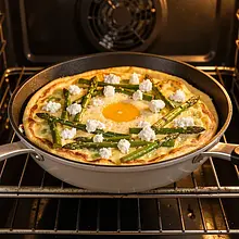 Frittata is an Italian omelette casserole, here served in a spring version with young asparagus and creamy cottage cheese. The dish combines the simplicity of Italian cuisine with a Polish touch – the cottage cheese adds a slightly tangy freshness, while sorrel and chives emphasize the seasonal character. Serve warm as a hearty main dish or as a snack for family gatherings; it pairs wonderfully with green salad and a piece of whole grain bread. Visually: a golden surface, green bundles of asparagus inside, and dollops of cheese for contrast.