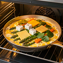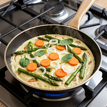 A light, fluffy frittata with seasonal young vegetables — an ideal choice for a spring breakfast, light lunch, or picnic. This dish originates from Italian cuisine, but here we use Polish seasonal ingredients: green asparagus, sorrel, young carrots, and spring onions. The frittata is encased in a thin, golden crust, while remaining creamy inside thanks to the eggs and cream; the cheese adds stretchiness and flavor. It can be served warm straight from the pan or at room temperature, with a salad of young leaves or sour cream. Enhanced with optional chives or feta cheese, it gains freshness and a slightly tangy contrast. This dish is easy to scale, great for using up vegetable leftovers, and budget-friendly for the season.