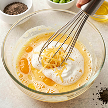 In a large bowl, crack the eggs. Add the cream, 1/2 teaspoon of salt (about 3 g together with later seasoning) and pepper. Whisk vigorously for 30–60 seconds until the mixture becomes smooth and slightly bubbly (this will incorporate air and ensure fluffiness). Add the grated cheese and gently mix with a fork to evenly distribute the cheese.