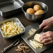 Potato fries are a classic snack, loved worldwide for their crispiness on the outside and softness on the inside. Easy to prepare and perfect as a side dish for many meals. Cut the potatoes into strips, coat them in olive oil, and bake until golden brown. A pinch of salt enhances their natural flavor. Perfect for any occasion, from family dinners to gatherings with friends.