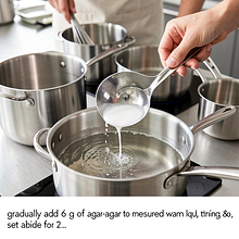 Pour the measured, warm (not boiling) liquid, evenly sprinkle in 6 g of agar-agar, stirring. Set aside for 2 minutes to allow the agar to "bloom." Then place the saucepan over low heat and bring to a boil, stirring constantly. Cook for 2 minutes from the moment it boils to ensure the agar is completely dissolved — stir evenly, collecting any foam from the surface.