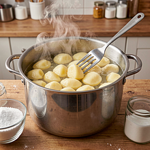 Wash the potatoes, dry them, and place them in a large pot. Cover with cold water so that the water covers the potatoes by about 2 cm. Add 5 g of salt. Bring to a boil over high heat, then reduce the heat and cook for 20-25 minutes (depending on size) until the potatoes are soft — check with a fork: the fork should go in smoothly without resistance.