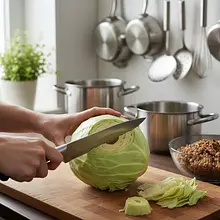 Prepare the cabbage leaves for wrapping. Cut off or gently crush (e.g., with the handle of a knife) the tough, thick rib at the base of each cooled leaf. This will make the leaf more flexible and easier to roll.