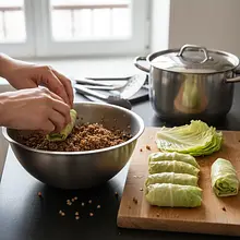 It's time to roll the cabbage rolls. In the center of each leaf, closer to the stem, place a portion of the filling (about 2-3 tablespoons). First, fold the stem end of the leaf over the filling (the part where you cut off the thickening). Then, fold in the left and right sides of the leaf. Finally, roll it all tightly towards the end of the leaf, creating a neat, closed package. Do the same with the remaining leaves and filling.