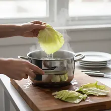 Carefully remove the cabbage from the boiling water and set it on a large plate or cutting board. Allow it to cool slightly. Now, starting from the outside, gently separate the leaves one by one. When you reach the tougher leaves in the center, you can put the cabbage back into the boiling water for another 5 minutes. Repeat the process until you have removed about 12-15 large leaves. Chop the remaining part of the cabbage and set it aside.