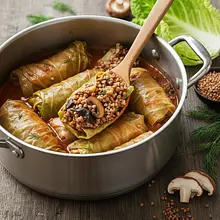 Pour the stuffed cabbage rolls with the reserved mushroom soaking water and vegetable broth so that they are almost completely covered. Bring to a boil over high heat, then reduce the heat to low, cover the pot, and simmer for about 60-90 minutes. The cabbage rolls are ready when the cabbage leaves are very soft.