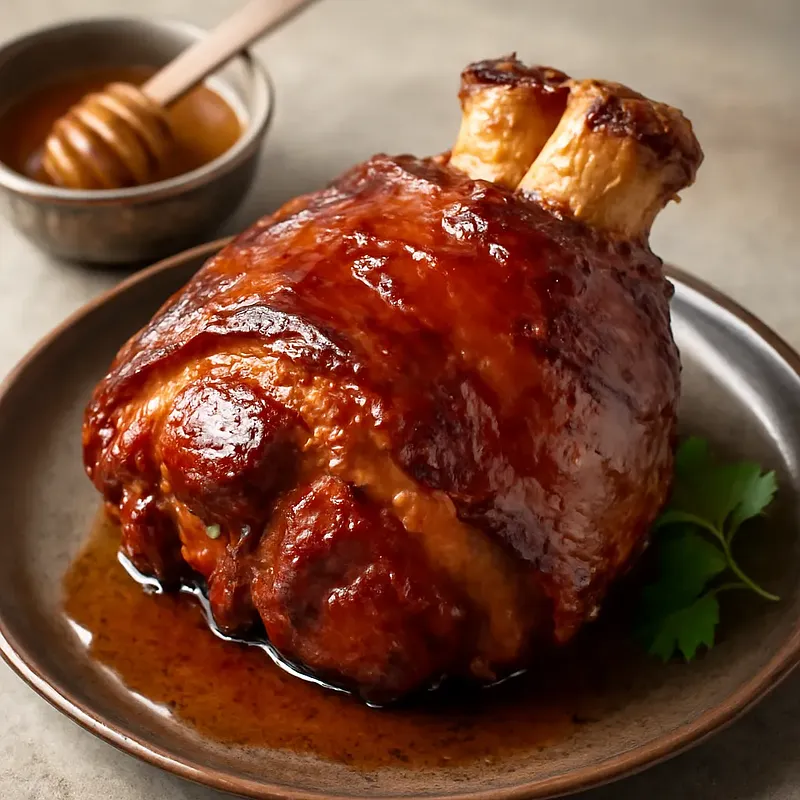 Honey-baked pork knuckle is a juicy, slightly sweet-glazed pork knuckle, with a crispy skin and tender, fork-falling-apart meat. This dish originates from Central European cuisine, where pork knuckle is valued for its intense flavor and rustic character. The combination of honey, mustard, and soy sauce gives the dish a complex umami taste with a delicate hint of sweetness and acidity, while the roasted skin adds an impressive appearance perfect for New Year's Eve 2025. Serve with roasted potatoes, sautéed cabbage, or bread and mustard. Qualities: contrast of textures (crispy skin vs. tender meat), aromatic glaze, and impressive presentation when sliced at the table.