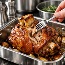 Check the pork knuckle with a fork: the meat should pull away from the bone and the skin should be crispy. If the skin is not sufficiently browned, set the oven to the broil function and roast for 3-6 minutes, watching closely to avoid burning. Let the pork knuckle rest for 10 minutes outside the oven before slicing, loosely covered with aluminum foil.