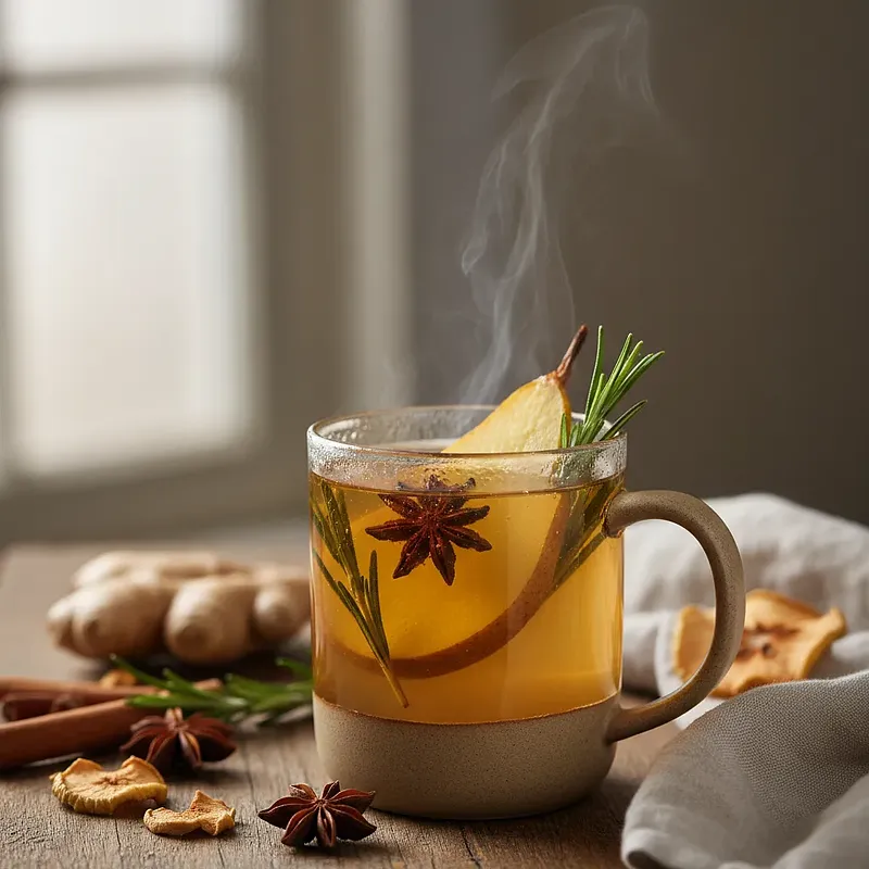 To aromatyczny, bezalkoholowy napój rozgrzewający, który jest kwintesencją jesiennych i zimowych wieczorów. Stanowi doskonałą alternatywę dla tradycyjnego grzanego wina czy piwa. Jego bazą jest naturalny, mętny sok gruszkowy, który nadaje całości głębokiej, owocowej słodyczy. Ostrości i charakteru dodaje świeżo starty korzeń imbiru, a korzenne przyprawy – laski cynamonu, goździki i anyż gwiazdkowy – otulają ciepłem i tworzą niezwykle bogaty bukiet zapachowy. Niespodziewanym, ale genialnym dodatkiem jest świeży rozmaryn, którego ziołowa, lekko leśna nuta wspaniale przełamuje słodycz i tworzy wyrafinowaną kompozycję smakową. Napój ma piękny, złocisto-bursztynowy kolor, a podany w szklanych kubkach z plasterkiem świeżej gruszki i gałązką rozmarynu prezentuje się niezwykle apetycznie. Idealny do podania podczas spotkań z przyjaciółmi, jako napój do deseru lub po prostu do wypicia pod kocem z ulubioną książką.