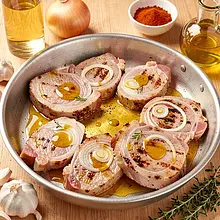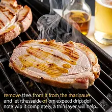 Prepare the marinade: pour 250 ml of light beer into a medium bowl. Add 30 g of mustard and 30 g of rapeseed oil (2 tablespoons). Peel the onion and grate it on a coarse grater directly into the bowl (using the grater will release the juice and sugars). Press 3 cloves of garlic through a press or finely chop and add to the mixture. Add 6 g of sweet paprika, 4 g of marjoram, 10 g of salt, and 2 g of black pepper. If you are using honey, add 15 g now — it will help achieve a glaze while grilling. Mix vigorously with a fork or whisk until the ingredients combine into a uniform emulsion.