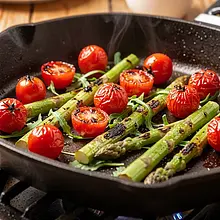 Grill the cherry tomatoes for 2–4 minutes, turning every 30–60 seconds, until the skin starts to crack and dark, thread-like grill marks appear. Grill the asparagus for 4–6 minutes, turning every 1–2 minutes — they should be firm but tender (test with a fork: they should pierce easily but not fall apart). Finally, quickly sauté the goat cheese rounds for 30–60 seconds on each side on a lightly greased surface, until they turn golden and warm up slightly.