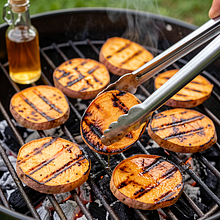 Preheat the outdoor grill to medium-high heat (about 200–220°C) or heat a grill pan over medium heat. Brush the grill grate or the surface of the pan with a thin layer of oil (use a brush or a piece of paper towel on tongs). Arrange the sweet potato slices with space in between to allow for air circulation and contact with the hot surface.
