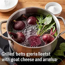 Trim all the leaves off the beets (you can save them for soup), and scrub the skin thoroughly under running water with a vegetable brush. Place the beets in a heavy-bottomed pot and cover them completely with cold water. Add 1 pinch of salt (1 g). Bring to a boil over high heat, then reduce the heat to medium and cook for 20–25 minutes (for a 200 g beet) — check with a fork: if the fork goes into the beet with slight resistance, they are done; if there is a lot of resistance, cook for another 5–10 minutes.