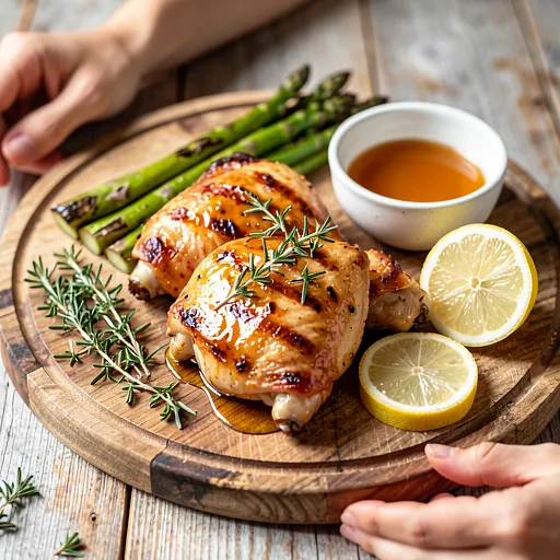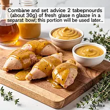 Prepare the glaze: pour honey (60 g) into a medium bowl. If the honey is thick, place the jar in a bowl of warm water for 2-3 minutes and stir until it becomes liquid. Add mustard (30 g), rapeseed oil (30 g), apple cider vinegar (15 g), juice and grated zest from half a lemon (about 50 g of juice/60 g of pulp — squeeze the lemon by hand over the bowl). Press the garlic (10 g) through a garlic press. Add sweet paprika (2 g), salt (6 g), and pepper (2 g). Stir with a spoon or whisk until the ingredients are combined and a smooth, sticky emulsion forms.