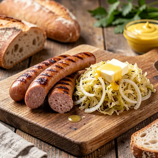 After grilling, set the sausages aside on a board for 3-5 minutes to allow the juices to redistribute evenly. Then, cut each sausage in half or serve whole. On a plate, place a portion of warm sauerkraut, and arrange the sausages next to it. Serve immediately with sides: rustic bread, mustard, or pickles.