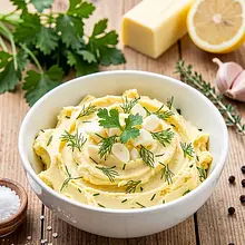 Make herb butter: cut the cold butter into small pieces. Finely chop the parsley, dill, and thyme leaves. Peel and crush the garlic through a press or chop it finely. Grate the zest from half a lemon (only the yellow part) and squeeze out 1 tablespoon of juice. In a bowl, combine the butter with the herbs, garlic, and lemon zest; mix thoroughly with a fork until the mixture is uniform. Season with 1 g of salt and a pinch of pepper (about 1 pinch).