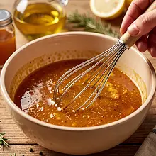 Prepare the marinade: in a large bowl, pour in canola oil (30 g), add honey (60 g), mustard (50 g), grated or pressed garlic (15 g), lemon juice (30 g), salt (10 g), black pepper (2 g), sweet paprika powder (12 g), and marjoram (2 g). Use a whisk or fork and mix vigorously for about 30-45 seconds until the ingredients combine into a smooth, slightly runny emulsion. Check the taste: the marinade should be distinctly sweet and spicy; if it's too sweet, add a little lemon juice.
