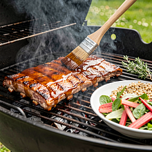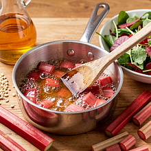 Prepare the rhubarb glaze base: wash the rhubarb, trim the tough ends, and cut the stalks into about 1 cm pieces. In a medium saucepan, combine the chopped rhubarb, honey, and apple cider vinegar. Heat over medium heat for 8–10 minutes, stirring frequently with a wooden spoon, until the rhubarb breaks down and a thick, slightly syrupy sauce forms. If it is too sour, add an additional teaspoon of honey. Remove from heat and let cool to a warm temperature.