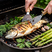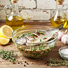 Wash the trout under cold water, then dry with a paper towel. If you are using whole fish, make diagonal cuts in the skin on both sides (2-3 cuts). In a bowl, pour in canola oil (30 g), squeeze the juice from half a lemon (about 50 g of juice), add finely chopped garlic (15 g), salt (6 g), black pepper (2 g), and dried thyme (2 g). Mix the marinade thoroughly with a fork or whisk until it becomes homogeneous.