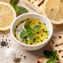 Prepare the mint-lemon sauce: pour 30 g of rapeseed oil (2 tablespoons) into a small bowl, add 50 g of lemon juice (about half a lemon), finely chopped leaves of mint from a 15 g bunch (drain and collect only the leaves), 3 g of salt, and 2 g of freshly ground pepper. Mix everything with a whisk or fork for 20–30 seconds until a uniform emulsion forms. Taste and adjust with a bit of salt or 5–10 g of honey if you want to balance the acidity (optional).