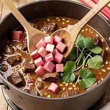 Mazurian wild boar goulash with rhubarb and pearl barley is a spring combination of game meat with a deep, forest flavor, slightly tart rhubarb, and hearty barley. The dish blends Mazurian tradition (game, smoked additions) with a spring twist (rhubarb, sorrel), creating a complex sauce with a sweet-sour-deep profile. Perfect for a family dinner or a festive gathering in nature. Serve hot on barley, with parsley and an optional spoonful of sour cream to soften the acidity; it pairs well with sauerkraut or young vegetables on the side.