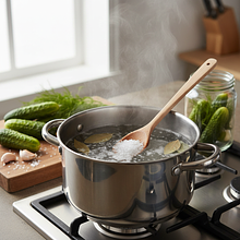 Prepare the brine. In a large pot, bring 2 liters of water to a boil. Once the water starts boiling, remove it from the heat. Add 50 grams (about 2 heaping tablespoons) of non-iodized rock salt. Stir vigorously with a long spoon until all the salt crystals are completely dissolved. Set the brine aside to cool completely – pouring hot liquid over the cucumbers will make them soft, not crunchy.