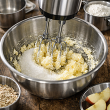 In a second bowl, place the soft butter (100 g from the prepared 120 g) and white sugar (100 g). Cream together with a wooden spoon or mixer on medium speed for 3–4 minutes until the mixture is light and fluffy. Add the eggs (120 g, one at a time), mixing well after each addition. Finally, add the dry mixture and mix with a spatula just until combined — the batter should be uniform, thick, but not overly beaten.