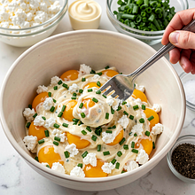 In a bowl with the egg yolks, add the crumbled cottage cheese (first break up larger pieces). If you are using mayonnaise, add it now. Finely chop the chives and add them to the bowl. Add salt and freshly ground pepper. Mix vigorously with a fork for 1–2 minutes, mashing the ingredients into a smooth, slightly creamy mass. The consistency should be firm enough to fill the egg whites, but not dry powder — if necessary, adjust with a teaspoon of mayonnaise.
