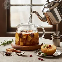 This is not just an ordinary tea; it is the essence of autumn captured in a cup. Imagine the aroma of freshly brewed black tea mingling with the spicy scent of cinnamon, cloves, and anise. Add to that the deep sweetness of baked apple, slowly releasing its flavor and juice, while a surprising, forest note of fresh rosemary breaks through. This drink is a ritual that warms the body and soothes the senses on cool, rainy evenings. It is perfect for serving to guests as a non-alcoholic mulled drink or as a luxurious beverage for yourself, accompanying a good book and a warm blanket. Visually, it looks stunning, especially in a transparent cup, where the whole baked apple surrounded by spices can be seen.