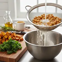 Open the can of chickpeas and transfer its contents to a sieve or colander. Rinse the chickpeas thoroughly under cold running water until the foam disappears. Then, dry them very well using paper towels. You can spread them out on a towel and gently roll them. The drier the chickpeas are, the crunchier they will be after baking.