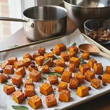 Line a large baking sheet with parchment paper. Spread the seasoned pumpkin on it in a single layer. Place the sheet in the preheated oven and bake for 25-30 minutes. The pumpkin is ready when it becomes soft (a fork should go in without resistance) and starts to caramelize, taking on a golden-brown color at the edges. Once baked, remove from the oven and let it cool completely.