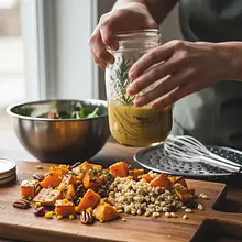 Prepare a small jar with a tight lid. Pour in the following ingredients in order: 3 tablespoons of olive oil (45g), 2 tablespoons of maple syrup, 1 tablespoon of Dijon mustard, and 1 tablespoon of freshly squeezed lemon juice. Add a pinch of salt and freshly ground black pepper to taste.