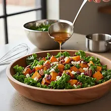 Ta sałatka to kwintesencja jesieni na talerzu. Łączy w sobie naturalną słodycz pieczonej dyni piżmowej, lekko gorzkawy, ziemisty smak jarmużu, chrupkość orzechów pekan i eksplozję soczystej kwasowości z pestek granatu. Całość spaja aksamitny, słodko-kwaśny sos winegret na bazie syropu klonowego i musztardy Dijon. Jest to danie nie tylko niezwykle smaczne, ale również wizualnie zachwycające dzięki bogatej palecie barw – od głębokiej zieleni, przez intensywny pomarańcz, po rubinową czerwień. Idealnie sprawdzi się jako samodzielny, lekki i pożywny posiłek na lunch, elegancka przystawka podczas uroczystej kolacji, lub jako dodatek do pieczonych mięs, na przykład indyka czy kurczaka. Każdy kęs to kompozycja różnych tekstur: miękkości dyni, chrupkości liści jarmużu i orzechów oraz soczystości granatu.