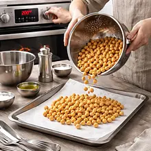 Preheat the oven to 200°C with fan (or 220°C without fan). Peel the pumpkin thinly with a kitchen knife, cut off the top and bottom, slice it in half lengthwise and remove the seeds with a spoon. Cut the flesh into even cubes about 2 cm on each side (cubes ensure even roasting). Place the chopped pumpkin on a large baking sheet lined with parchment paper, drizzle with 1 tablespoon of oil (15 g) and sprinkle evenly with 1.5 g of salt. Toss on the sheet with a silicone spatula to coat each cube with oil.