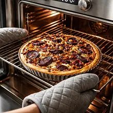 Use the top and bottom heating function. Check with a toothpick: if the mixture does not stick to the toothpick, the tart is ready. After removing, wait 10–15 minutes before cutting to allow the filling to set slightly.