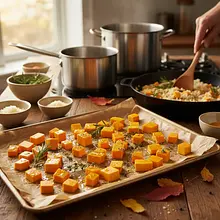 Transfer the chopped pumpkin onto a baking sheet lined with parchment paper. Drizzle with half of the olive oil (about 15g), and sprinkle with salt and pepper. Mix thoroughly with your hands to ensure each piece is coated with oil and seasonings. Spread the pumpkin in a single layer and place it in the preheated oven. Bake for 25-30 minutes, until the pumpkin is tender and slightly browned at the edges. You can check its tenderness by piercing a piece with a fork.