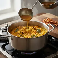 Reduce the heat to medium-low. Start adding hot broth, one ladle at a time. After adding each portion of broth, stir the rice slowly and almost continuously until the liquid is completely absorbed. Only then add another ladle. Repeat this process for about 18-20 minutes. Stirring releases the starch from the rice, creating a creamy sauce.